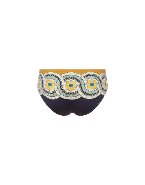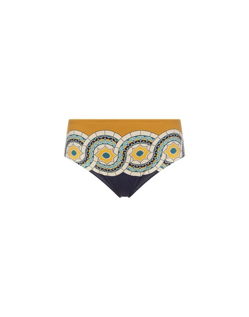Find back-up for your butt in our ample coverage Bow Briefs. Not as gigantic as our Giga Briefs, and not as small as our Bow style, this Boy design has a slightly higher rise on the tummy and cuts forgivingly on the butt. Crafted in our luxurious and long-lasting Supreme Lycra, they arrive in this Deco-inspired, hand-placed Mudejar print for your next ultra chic pool plunge.