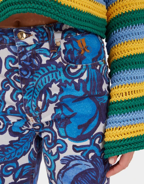 Who knew denim could be this fancy? With joy sewn directly into the seams, these jeans are the perfect summer to September transition trousers. Arriving in a shape similar to our iconic Hendrix Pant with a cropped, slim fit that widens a touch at the knee, these beauties come awash in our favorite Anemone print, with a removable feathered cuff that feels anything but fussy. We love these paired with our slogan tees, but they look just as elegant taken out on the town with a statement printed wedge and 24/7 Jacket.