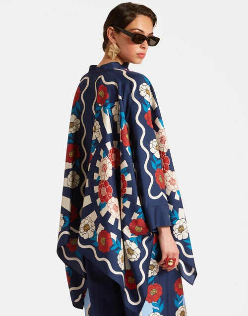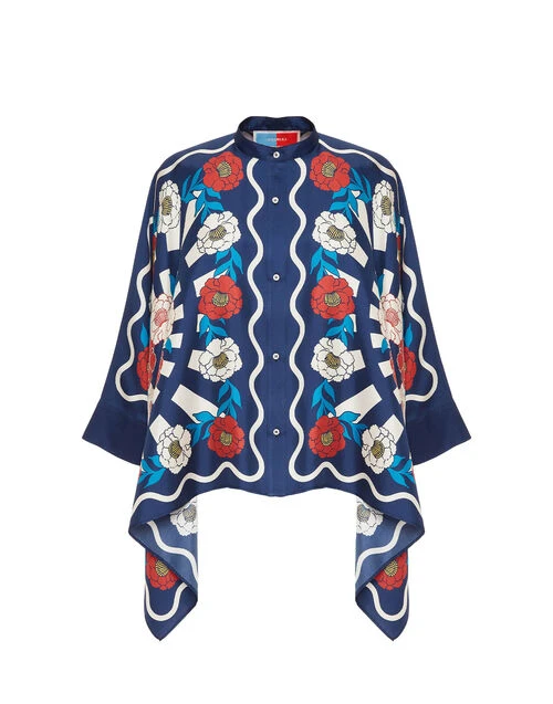 ​​A J.J. staple year-round, we’ve reimagined our bestselling silk Foulard Shirt this season with British vacationwear dream team Orlebar Brown, delivering it in this whimsical Whitsun print inspired by the king of flowers. Part shirt, part poncho, it’s crafted in fluid Italian-made silk in a chic waterfall style fit that is flattering on all shapes and sizes. Draping off the arms with a Korean collar and buttons down the front, it’s beautiful when styled with the matching Palazzo Pants on the boardwalk, or unbuttoned over a swimsuit at the beach bar.