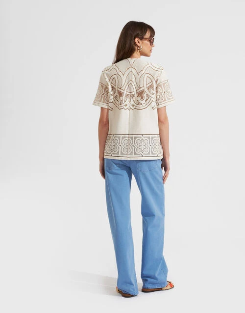 Who needs a plain white tee when you could have a trophy T-shirt? Our House silhouette is exactly that, crafted in our new weightless white cotton lace to bring a molto elegante spin to your summer work wardrobe or Saturday night ensemble. With a boyfriend shape that’ll elevate with an insouciant spirit, we’ve left it unlined to highlight every stitch of that exquisite embroidery. Throw over a swimsuit for your schlep to the Mezzatorre pool or style up with the matching Oscar skirt for a dreamy look that’ll take you from vineyard weddings to garden parties, beach soirees, and beyond.