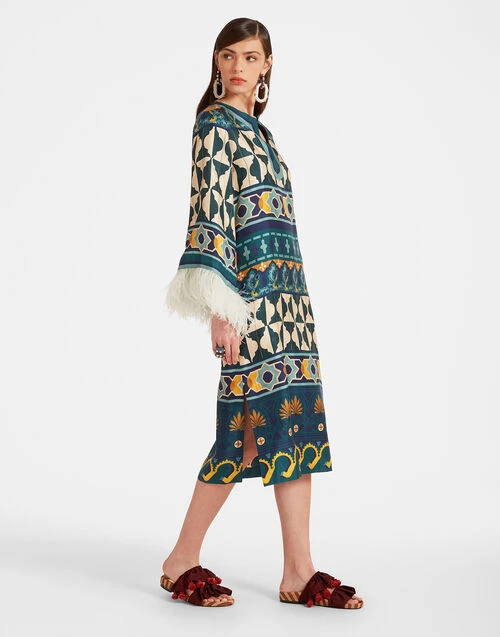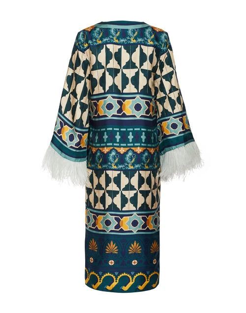 The Kaftan Casareale Placèe Emerald In Silk Twill With Feathers